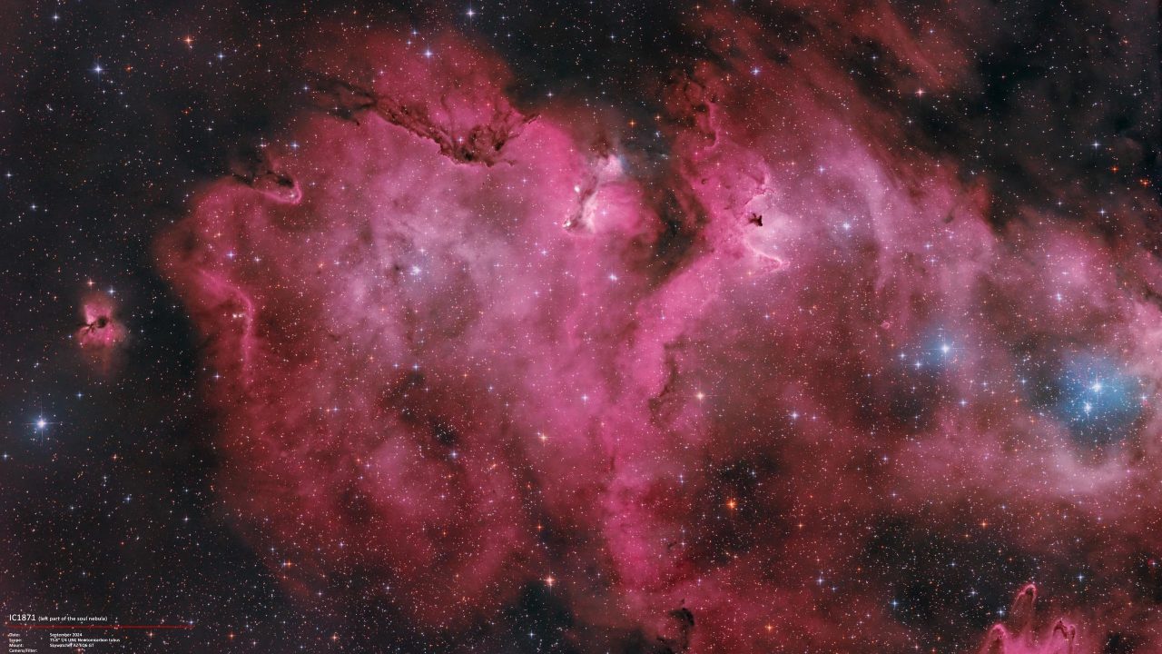 Der Komplex östlich davon ist sein Nachbar IC 1805 der sogenannte Herznebel. Beide werden oft zusammen Herz- und Seelennebel genannt.