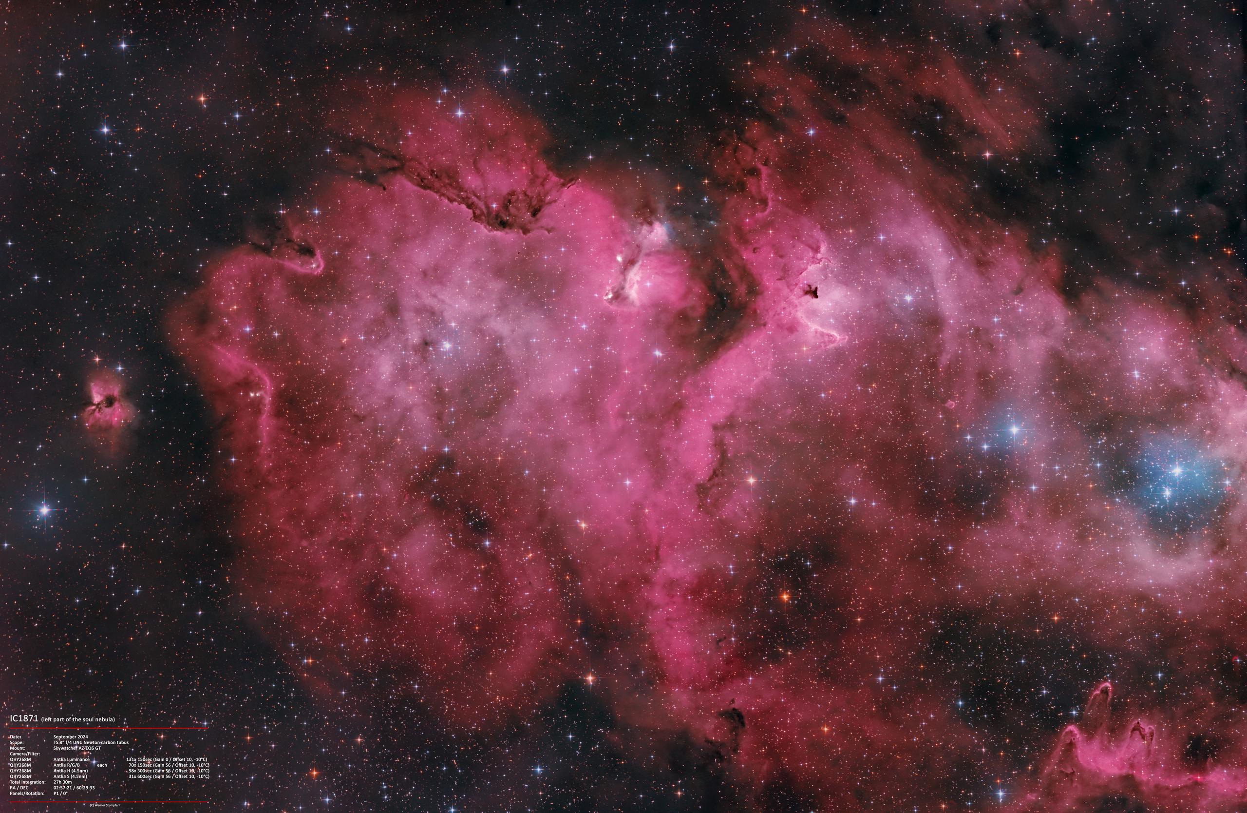 Der Komplex östlich davon ist sein Nachbar IC 1805 der sogenannte Herznebel. Beide werden oft zusammen Herz- und Seelennebel genannt.