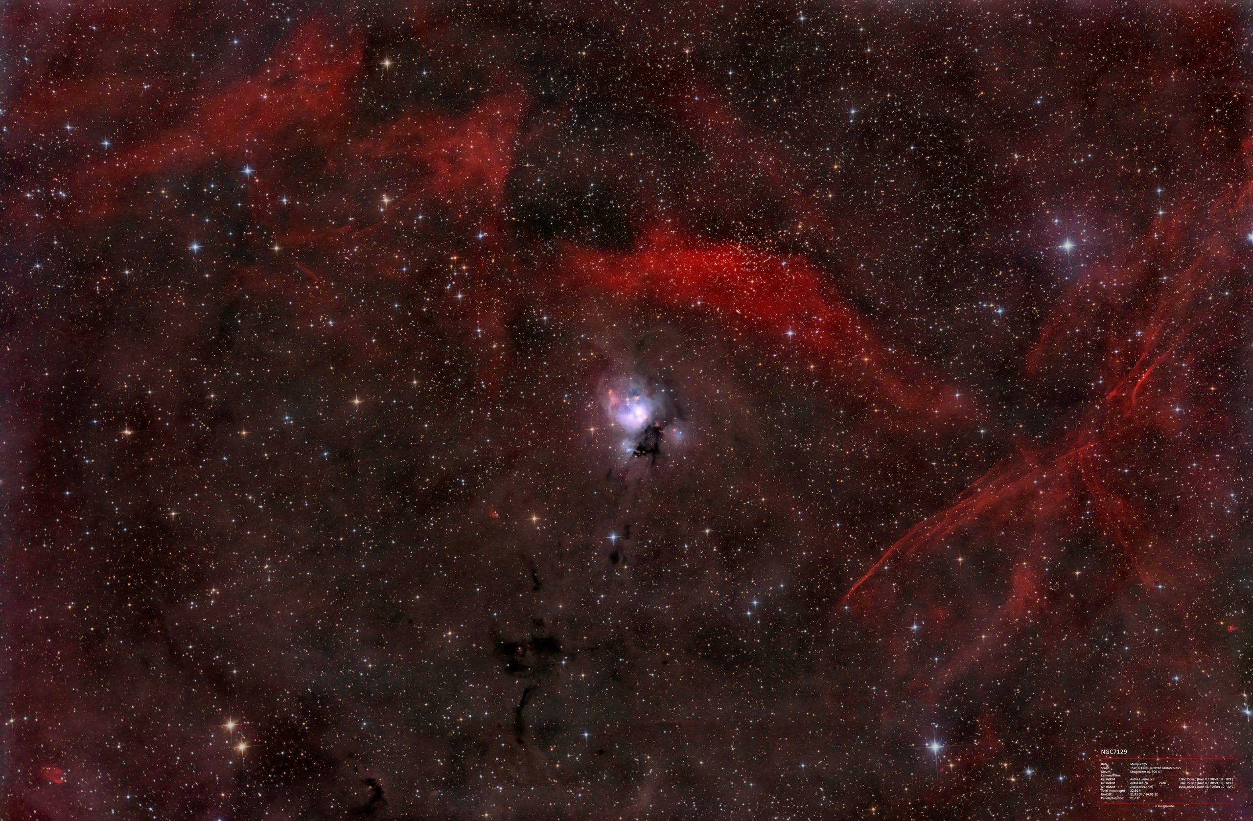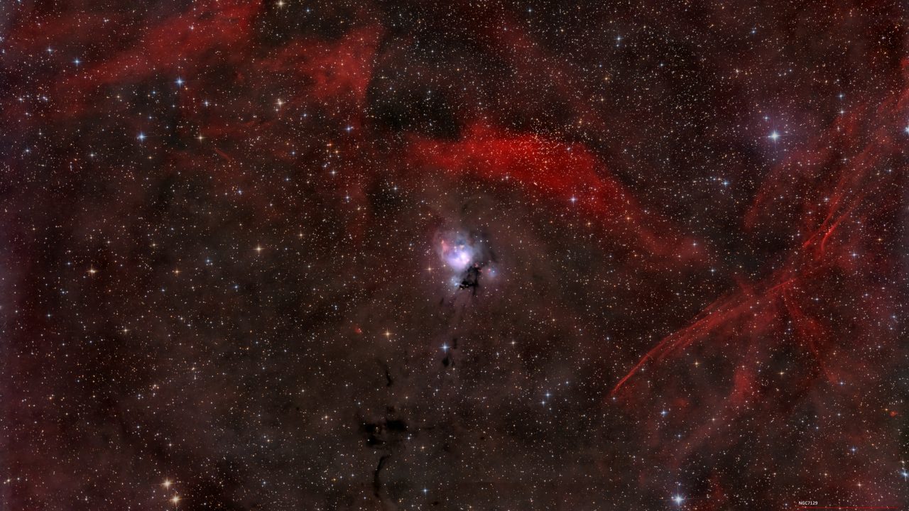 NGC 7129 ist ein Reflexionsnebel im Sternbild Kepheus am Nordsternhimmel, der etwa 3500 Lichtjahre von der Erde entfernt ist. Er hat eine Ausdehnung von etwa zehn Lichtjahren. Ein offener Sternhaufen mit etwa 130 jungen Sternen, die jünger als eine Million Jahre sind, bringt NGC 7129 zum Leuchten.