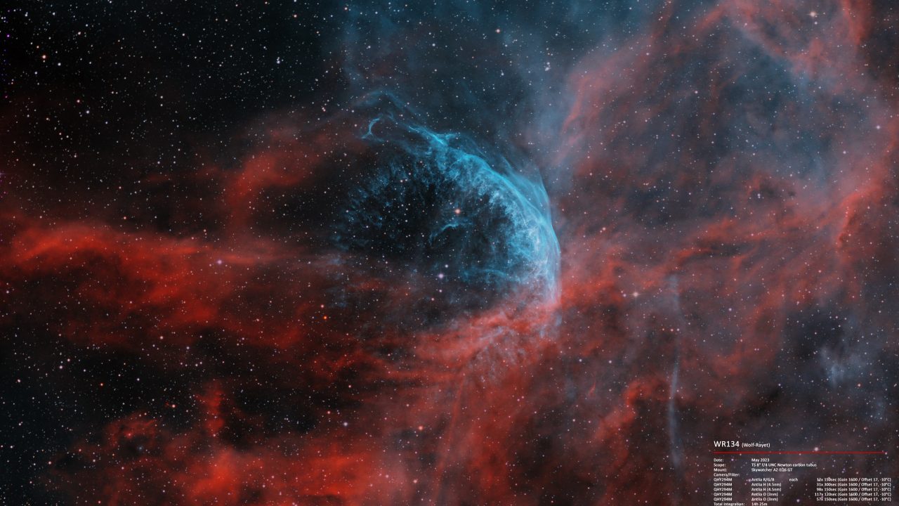 WR 134 ist ein variabler Wolf-Rayet-Stern, der sich etwa 6.000 Lichtjahre von der Erde entfernt im Sternbild Cygnus befindet und von einem schwachen Blasennebel umgeben ist, der von der intensiven Strahlung und dem schnellen Wind des Sterns geblasen wird. Er hat den fünffache Radius der Sonne, aber aufgrund einer Temperatur über 63.000 K ist sie 400.000 mal so hell wie die Sonne.