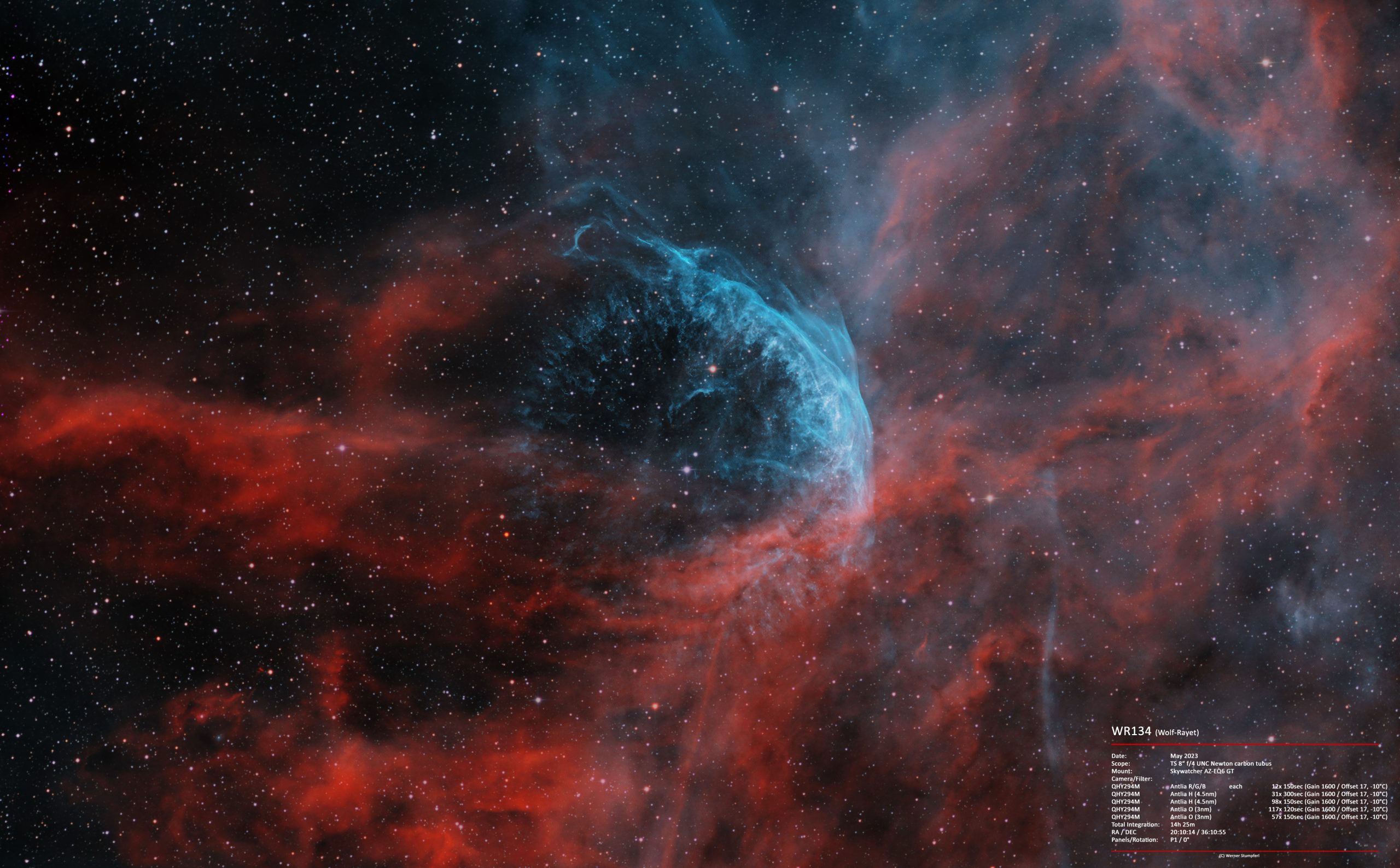 WR 134 ist ein variabler Wolf-Rayet-Stern, der sich etwa 6.000 Lichtjahre von der Erde entfernt im Sternbild Cygnus befindet und von einem schwachen Blasennebel umgeben ist, der von der intensiven Strahlung und dem schnellen Wind des Sterns geblasen wird. Er hat den fünffache Radius der Sonne, aber aufgrund einer Temperatur über 63.000 K ist sie 400.000 mal so hell wie die Sonne.