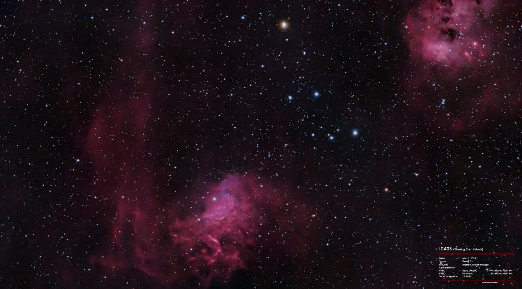 Ich habe zum einem IC405 (Flaming Star) in 3 Nächten in Dualband (194x 60sec) sowie dem Astro-Filter (474x 60sec) aufgenommen, insgesamt also rund 11 Stunden. Der Dwarf hat die 3 Sequenzen gestackt und ein ordentliches Bild zusammen bekommen. Ich habe mir jedoch alle FITS-Dateien auf den PC geladen und mit Astropixelprozessor und Photoshop meinen ganz normalen Workflow durchgearbeitet. Das Ergebnis ist natürlich deutlich besser als wenn der Dwarf das selbst macht. Hier das Ergebnis.