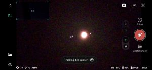 Um es gleich vorweg zu sagen, Planeten aufnehmen macht mit dieser Brennweite keinen Sinn. Jupiter ist ein winziges Scheibchen und aussen rum sieht man 4 Punkte (die 4 größten Monde). Saturn habe ich nicht probieren können, aber vermutlich kann man die Ringe gerade mal als „den“ Ring erahnen können.