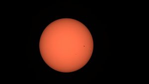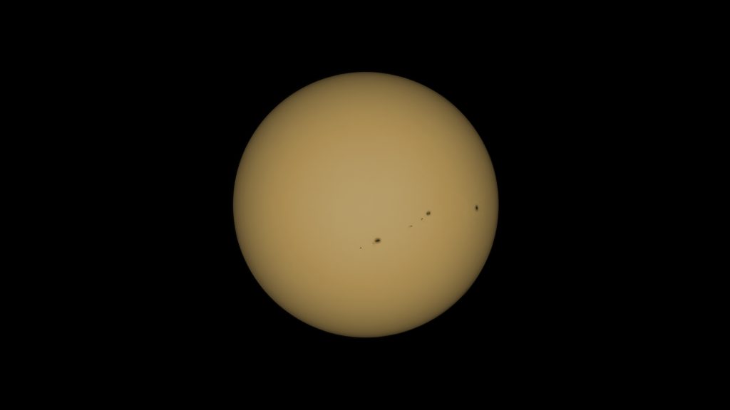 Ich habe den Dwarf3 dann auch mit dem beigelegten Sonnenfilter die Sonne im Weißlicht aufnehmen lassen, ein paar Hundert Bilder und mit AS3 gestackt und mit Photoshop nachbearbeitet.